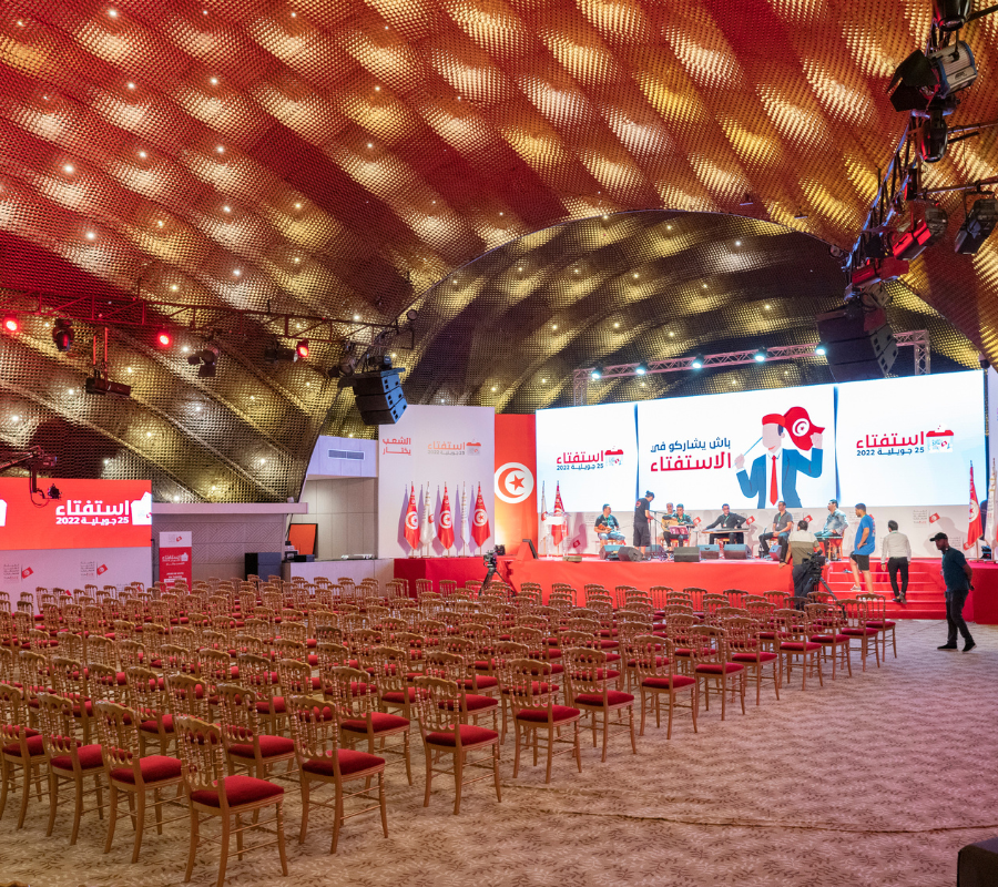 Notre équipe s’est mobilisée pour aménager le centre des médias de l’ISIE lors du référendum du 25 Juillet et des élections législatives de 2022, et ceci en effectuant tous les travaux d’aménagement d’espace, de branding, conception et habillage du fond de scène, conception des cabines, cloisons, et l’habillage des murs et des desks, pour donner au palais des congrès sa plus belle allure et image.